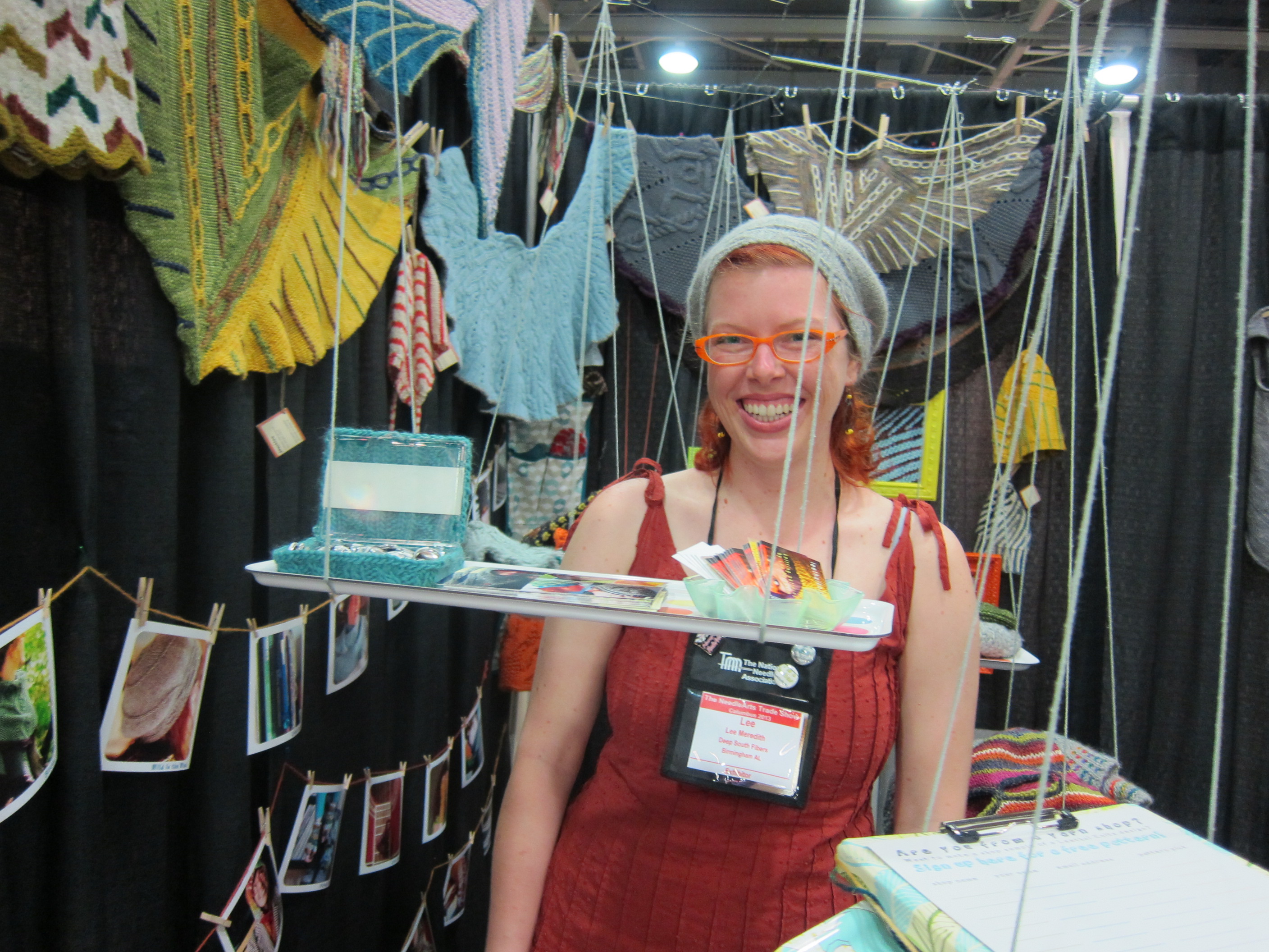 So my business cards, postcards, buttons, and lots of smaller sample knits, were all on the tray tables. It was a bit unwieldy, functionally-speaking… people were afraid if they walked into the booth and bumped into the trays everything would fall; but that wasn’t true, I made sure they were very stable. Overall, it didn’t turn out perfectly, but I was pretty happy with the booth setup 🙂