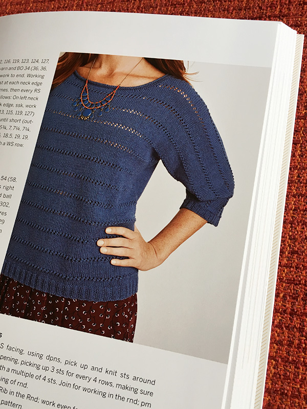 This subtly-striped sample is in two colorways of madelinetosh tosh merino worsted weight yarn, both of which are variegated and share a shade of teal, making the stripes really blend together: